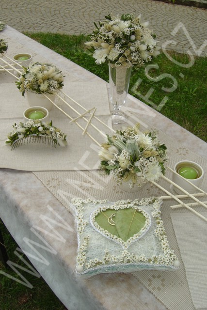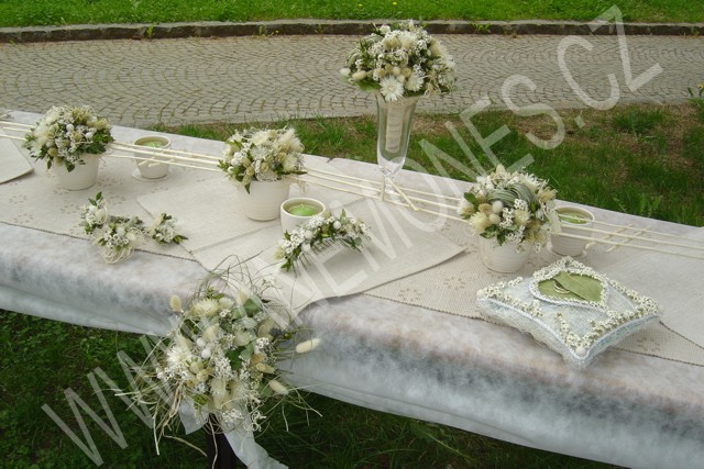 Svatba! Svátek emocí, den s velkým "D"! Den, kdy "Já" se mění v "My". Výjimečný den, kdy nesmí chybět květina. Svatební kytice jsou magické. Květiny vyjadřují mimořádnost svatby. Květina a nevěsta jsou v hlavních rolích tohoto dne. Nevěsta a ženich květinami oznamují, že patří k sobě. Nevěsta, ženich a květiny jsou taktéž nezapomenutelným zážitkem svatebního dne. Svatební kytice rovněž můžete sušit a uchovat tak jejich krásu po léta. Pokud i vy chcete mít na své svatbě originální a krásnou výzdobu, využijte našich kontaktů v levé části této stránky a neváhejte nám sdělit vaše představy a přání. |